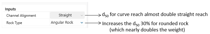 Finally, the user must specify whether the rock is angular or rounded. This has the same effect as it does on the USACE riprap method. Rounded rock diameters must be 30% larger (which translates to almost 100% larger by weight).