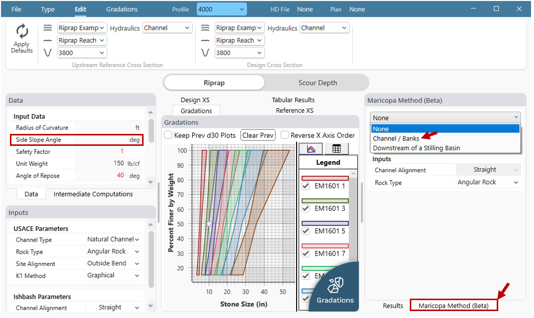 The latest version of HEC-RAS includes the "Maricopa Method" in addition to the USACE method from EM 1601. The Maricopa Method was developed by the Flood Control District of Maricopa County and is described in the 2018 Drainage Design Manual for Maricopa County, Arizona, - Hydraulics (See Section 6.6.3 Riprap Lined Channels). The Maricopa Method is a case-dependent modification of the Ishbash Equation (which is also in the latest version of HEC-RAS). In version 6.3, only Ishbash-related Maricopa County’s riprap sizing equations are implemented. Other riprap sizing equations from Maricopa County will be implemented in the future versions