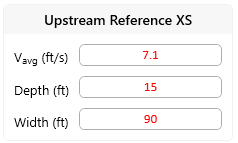 The Riprap Calculator will automatically populate the average velocity, depth, and width associated with the Upstream Reference Cross Section, and XS Hydraulics (channel or full cross section) selected.