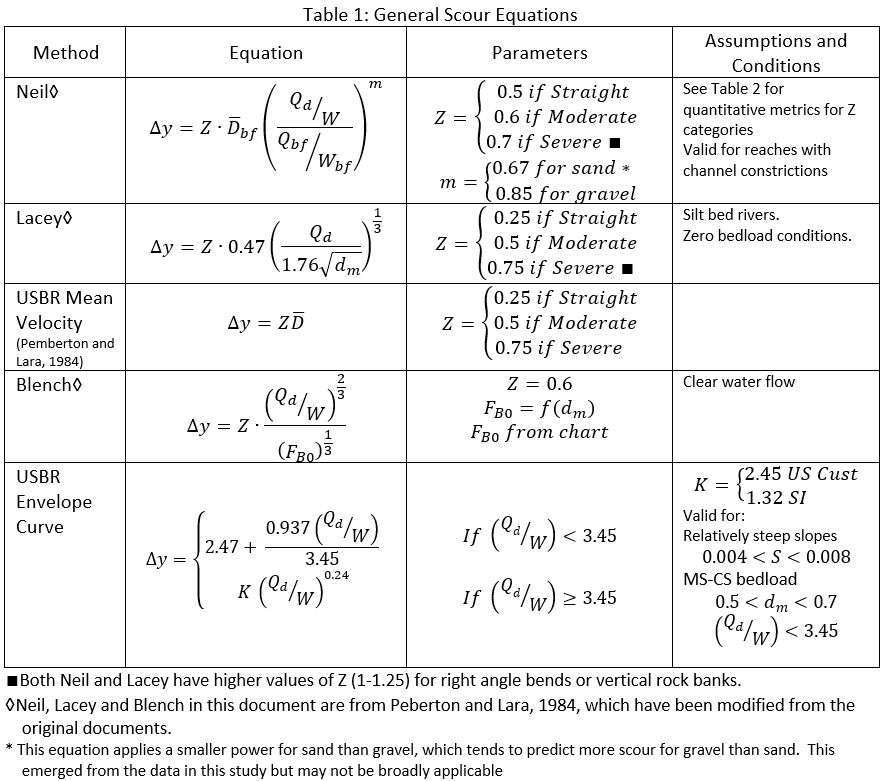 It is very difficult to predict potential flood scour potential without historical measurements or a calibrated numerical model. However, it is important to consider scour failure modes even when data or calibrated models are not available. A suite of simple, empirical equations can bound the potential scour risk in these situations. These equations are not universally applicable and often generate a wide variety of scour depths. But applying the applicable equations - in an ensemble approach - can provide a possible range of scour depths. Many of these methods were collected in the US Bureau of Reclamation design manual (Pemberton and Lara, 1984) and despite their age and limitations remain the standard practice at the time of publication.