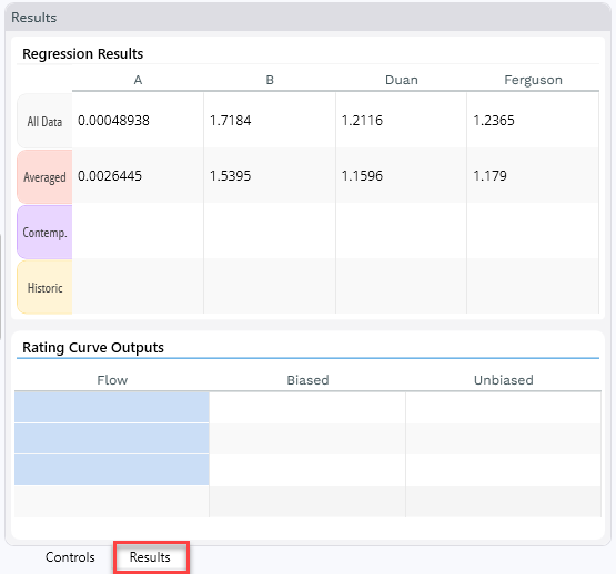 After the analyses and visualization, modelers and analysts eventually will want to reproduce the rating curve. To get the rating curve results, go to the Results tab (that is grouped with the Controls in the standard layout).