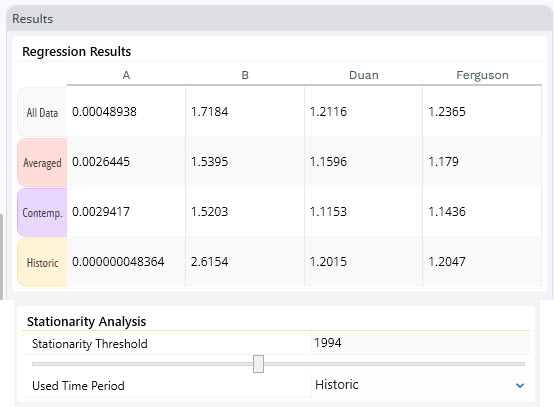 If you use the Stationarity Control (e.g. the results below are associated with the stationarity control bar also pictured below) the analytical rating curve results will also populate the coefficients for the "historic" and "contemporary" regressions. The historic regression includes the data before the split-year selected in the stationarity scroll bar and the "Contemporary" coefficients reproduce the power function fit to the data points more recent than the stationarity threshold.