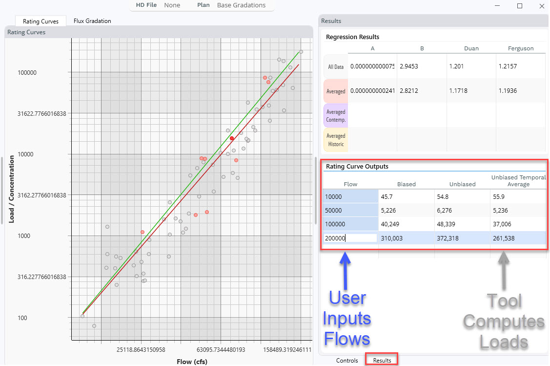 The tabular data requires user input. It is blank by default. The user must input flows (see figure below). When the user inputs flows, the tool will compute loads with the active methods (the methods used in the Control menu). In the example below, the user input four flows and the tool returned the biased and unbiased results, assuming all measurements were independent and the unbiased results (with the method selected in the Controls menu - Duan in this case) with temporal averaging. The tool returns the Unbiased, Temporally Averaged results by default, because these are considered best-practice for most systems. These results were transposed into the HEC-RAS sediment boundary condition above.