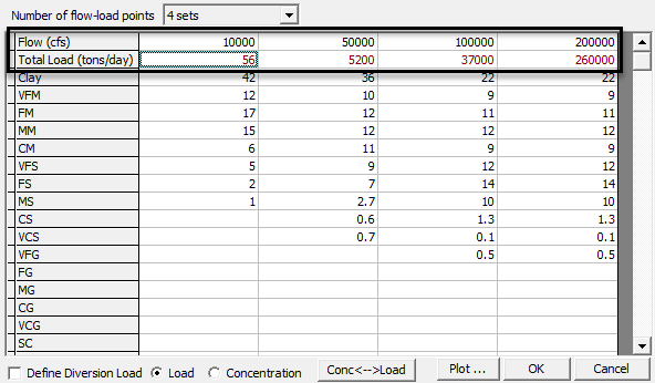 HEC-RAS sediment, rating-curve boundary conditions require a tabular flow-load or flow-concentration rating curve. An example of a flow-load rating curve boundary condition in the HEC-RAS sediment model is included below.