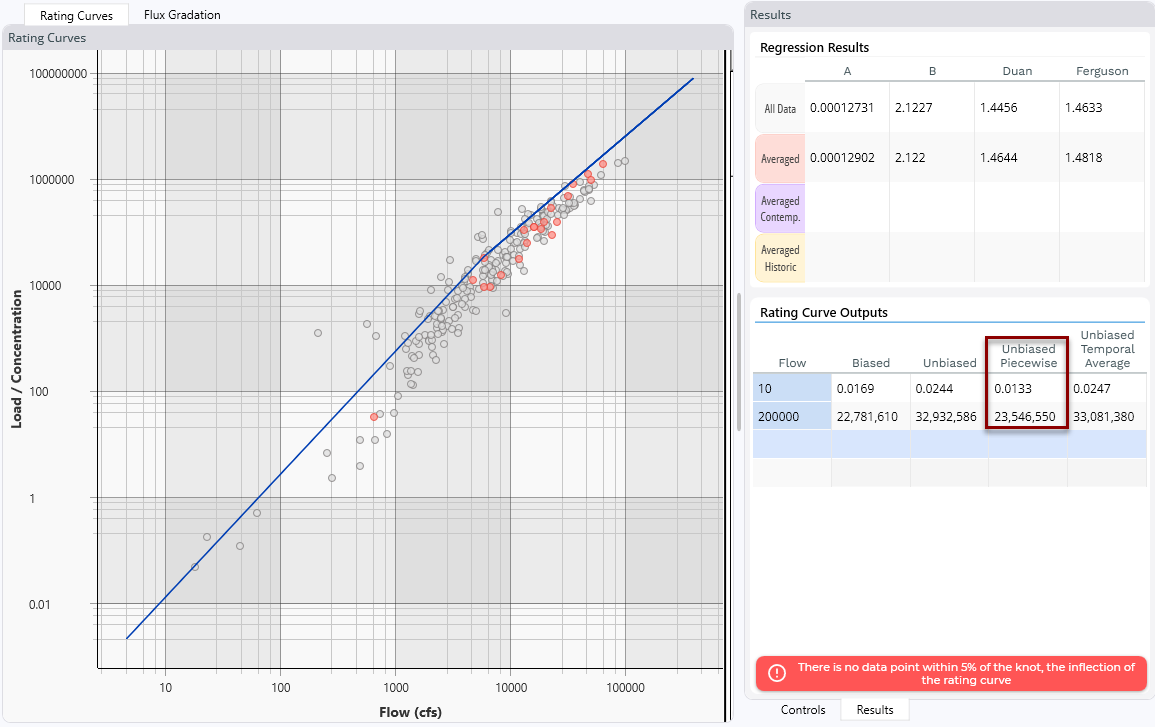 Flow-load power functions can be defined with two points (these points should bound the highest and lowest flows expected, not the highest and lowest flows observed in the data). But a piecewise linear result requires at least three, and should include a point at or very close to the inflection point (i.e. the "knot"). For example, in the result below, the user has only entered bounding flows (high and low) in the tool. The tool is providing an error message, that to get good results from the piecewise linear tool, they must include a flow close to the inflection point (or knot).