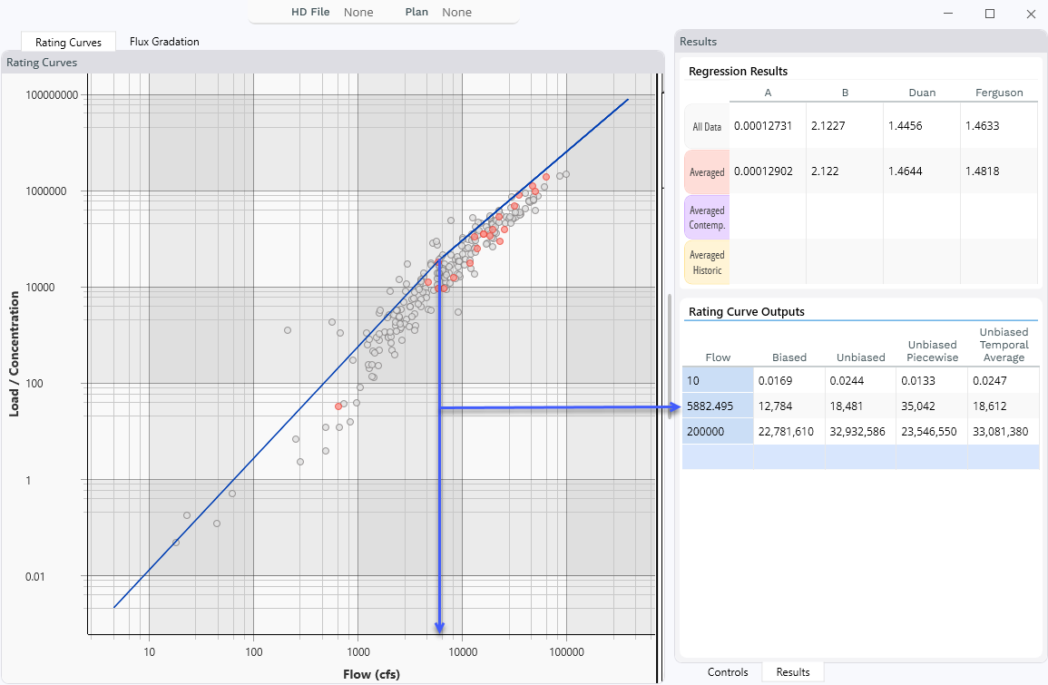 The tabular results reproduce the rating curve with two or more points. To compute loads for other flows, modelers and scientists will have to interpolate between these flow-load pairs. But these are logarithmically distributed data that fall along a power function (log transformed linear relationship). A simple linear interpolation is not appropriate. HEC-RAS log-interpolates between these data. Other applications should as well.
