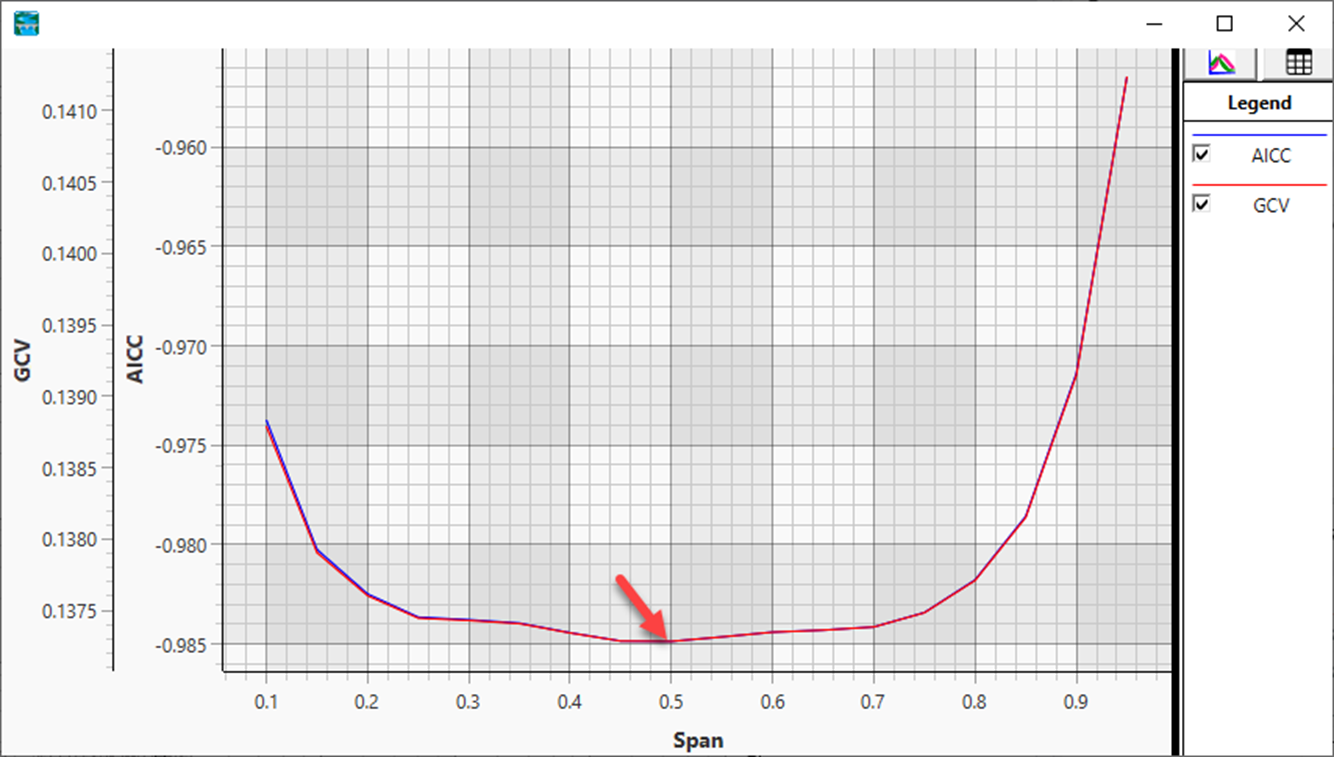 To evaluate the span metrics users can select View LOESS Prediction Graph which plots the GCV and AICC metrics for the whole range of spans. In the example below, the 0.5 is the minimum of both metrics, but the results from 0.4 to 0.7 are relatively consistent, so anything in this range would be appropriate.