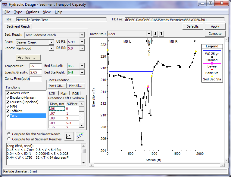 A text box is provided for brief descriptions of selected transport functions. In addition to a summary of the selected function, the range of input parameters, from both field and laboratory measurements, used in the development of the respective function is also provided. Where available, these ranges are taken from those found in the SAM package user's manual (Waterways Experiment Station, 1998) and are based on the developer's stated ranges when presented in their original papers. The ranges provided for Engelund and Hansen are taken from the database (Guy, et al, 1966) primarily used in that function's development.
