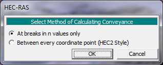 - The default method for calculating conveyance in HEC-RAS is different from HEC-2. However, HEC-RAS has the ability to compute conveyance with the HEC-2 methodology. If you are trying to reproduce HEC-2 results, you may want to switch HEC-RAS to the HEC-2 method of computing conveyance. To do this, from the Steady Flow Analysis window select Options from the menu bar then select Conveyance Calculations. When this is selected, a pop up window will appear as shown in figure shown below. There are two options available, the HEC-RAS default method (break in n-value method) and the HEC-2 style method. Select the HEC-2 style method if you are trying to reproduce HEC-2 results. For more information on the differences in conveyance calculations, see Appendix C of the HEC-RAS Hydraulic Reference manual.