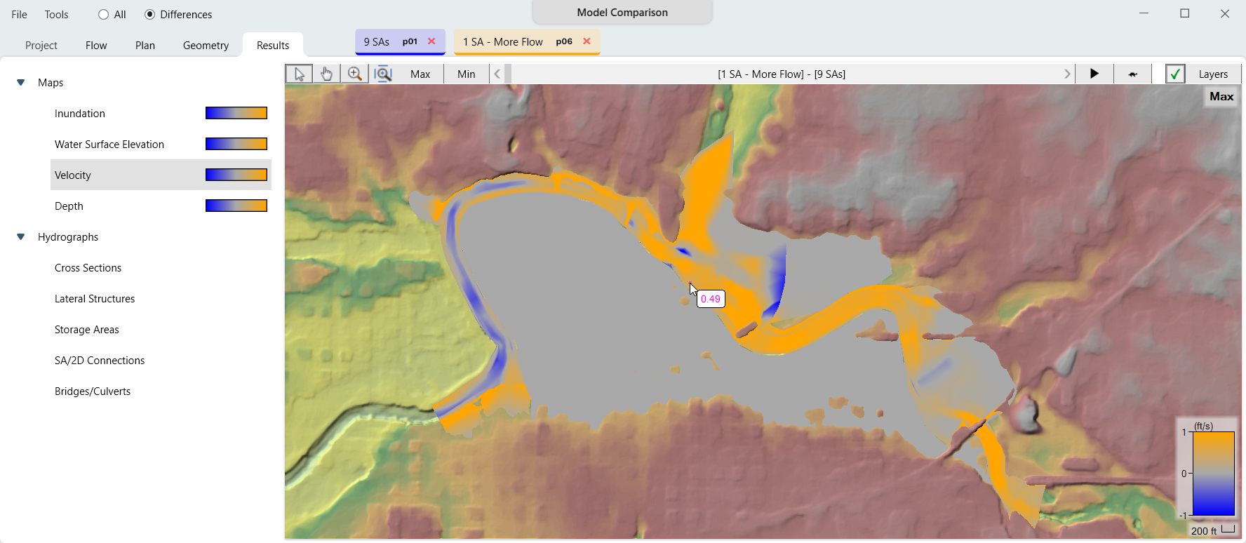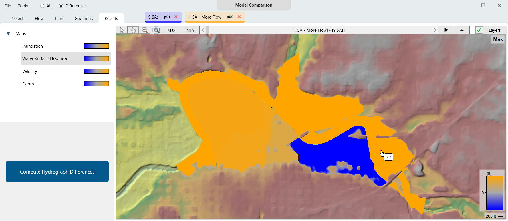 If you are comparing a Plan with Results, the Result tab will be available. At this time, the spatial results can be evaluated for differences in Inundation extent, Water Surface Elevation, Velocity, and Depth. Hydrograph results are also available, however, you will need to press the Compute Hydrograph Differences button.