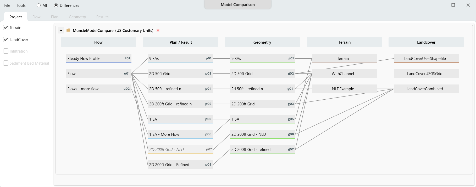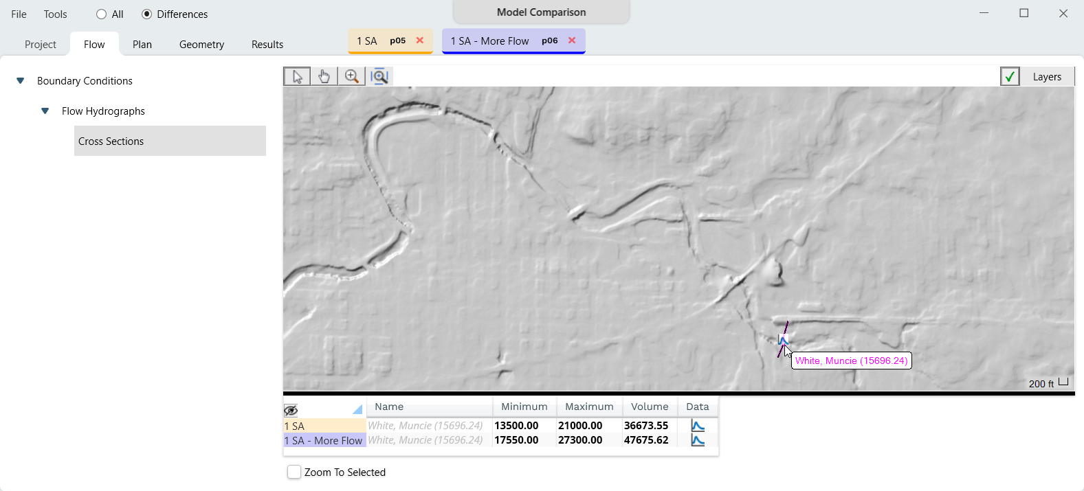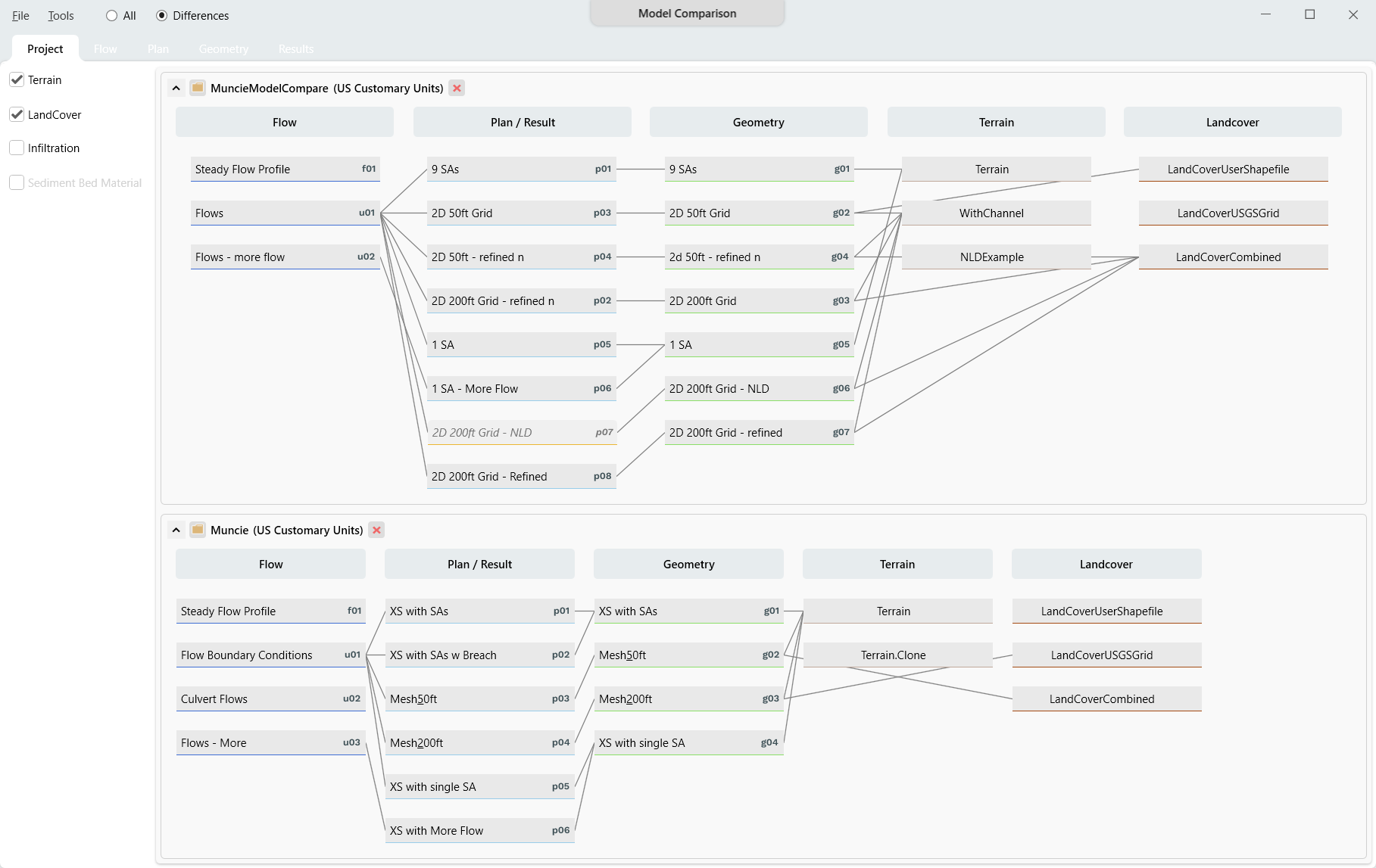 The Model Comparison Tool in HEC-RAS in intended to allow users to evaluate the components of an HEC-RAS project to identify differences in the primary modeling objects. The purpose of the comparison tools is to assist the user to identify subtle differences between HEC-RAS plans. If the model differences are significant and excessive Differences in the project files, geometry, flow, and results can be visualized through tables and spatial plots. The focus of the Model Comparison tools are for unsteady-flow models (comparison capabilities for steady-flow models is not as robust as for unsteady models).