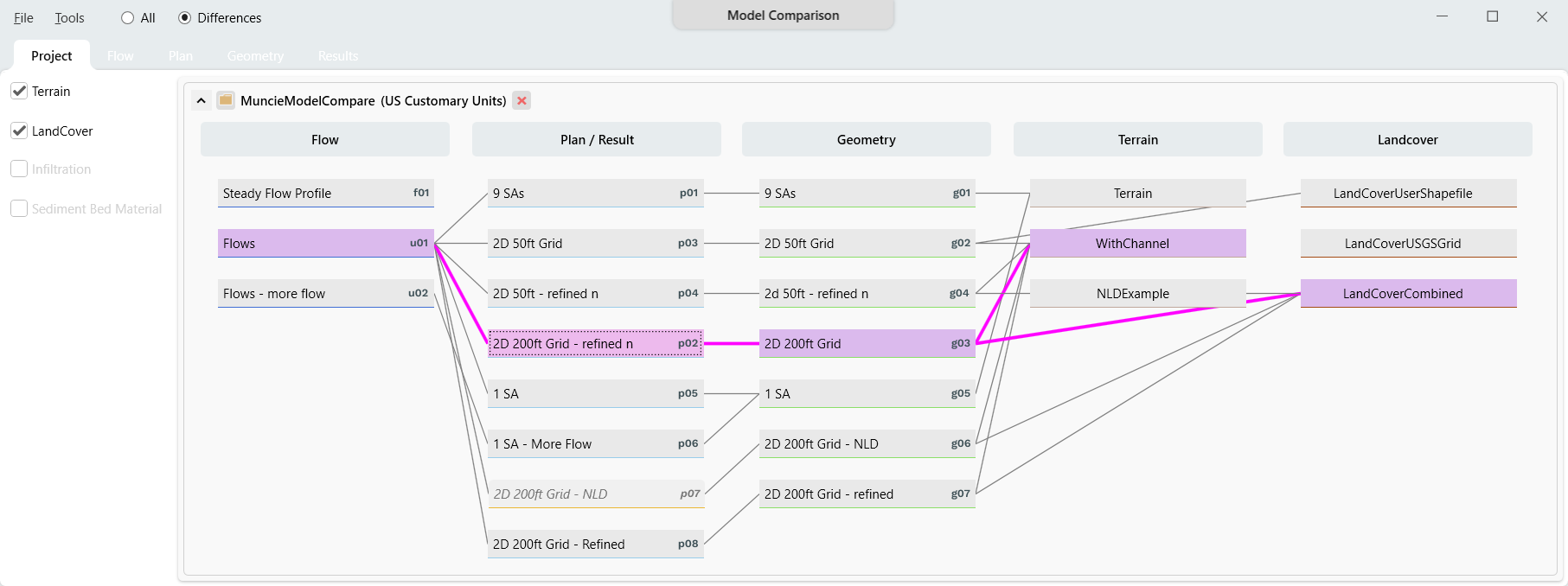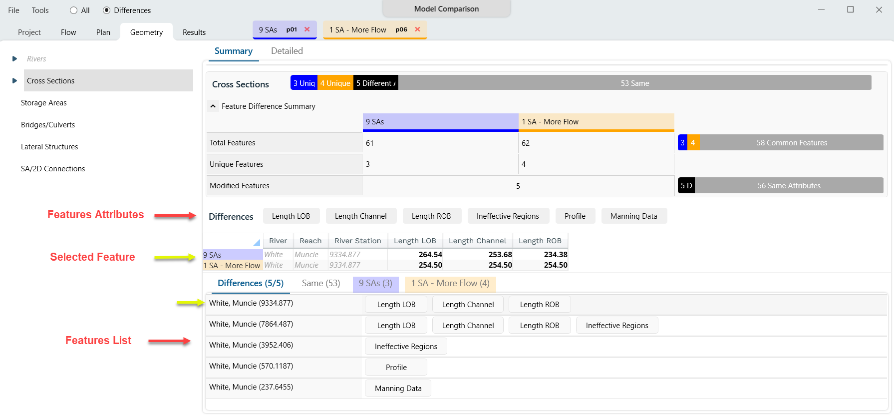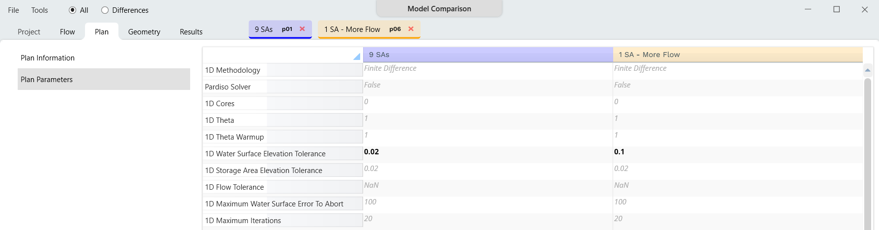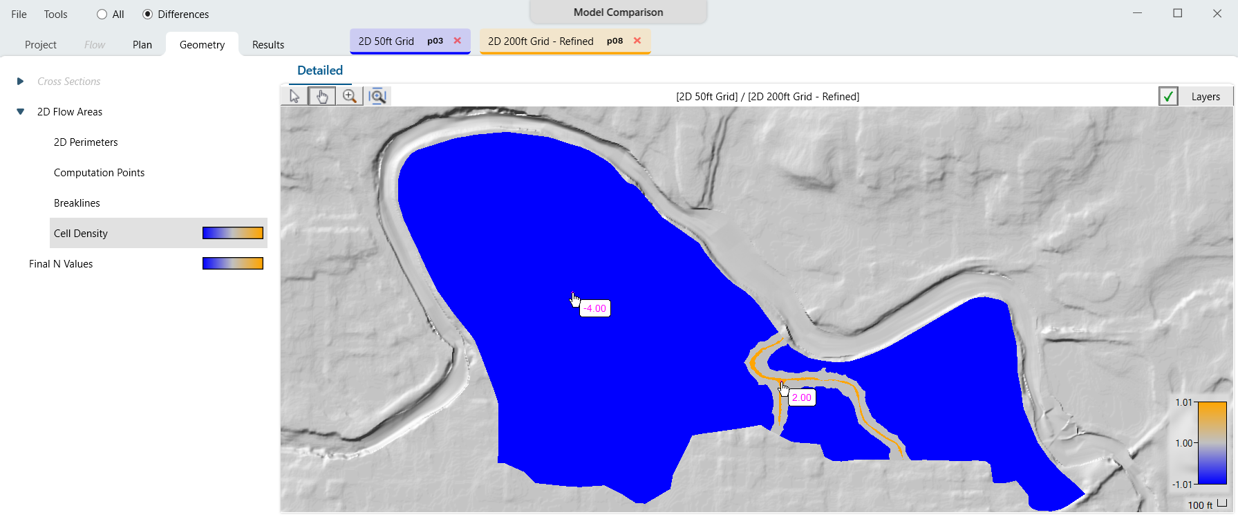 The Model Comparison Tool in HEC-RAS in intended to allow users to evaluate the components of an HEC-RAS project to identify differences in the primary modeling objects. The purpose of the comparison tools is to assist the user to identify subtle differences between HEC-RAS plans. If the model differences are significant and excessive Differences in the project files, geometry, flow, and results can be visualized through tables and spatial plots. The focus of the Model Comparison tools are for unsteady-flow models (comparison capabilities for steady-flow models is not as robust as for unsteady models).