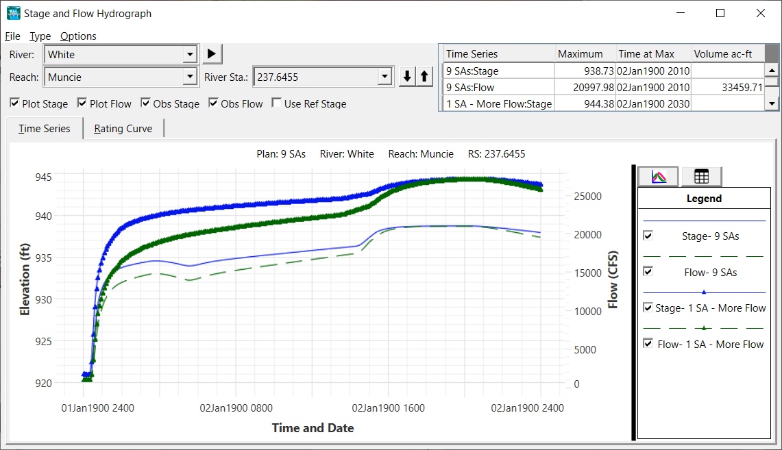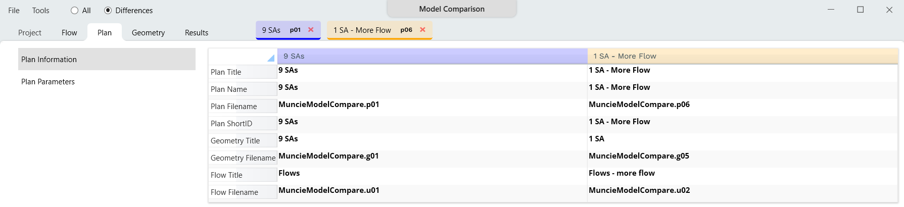Plan information for basic information such as the Geometry and Flow file names and more detailed computation parameters are provided through tabular data. The tables easily allow you identify model differences.