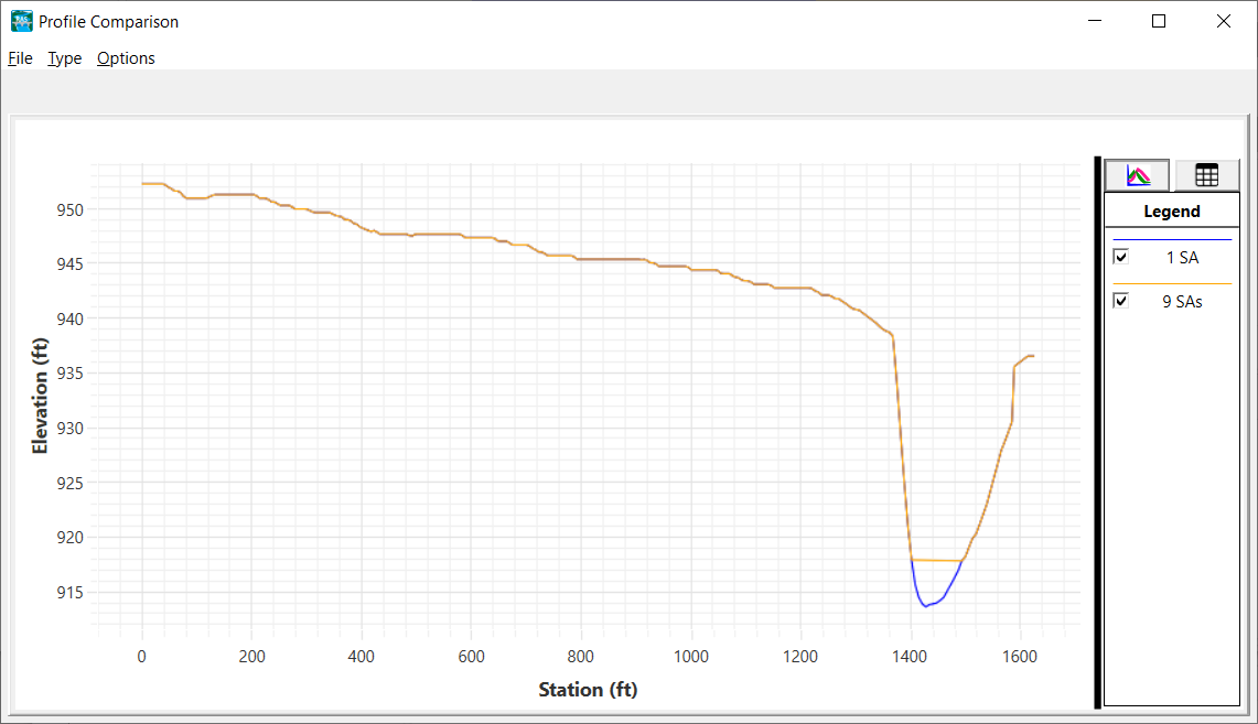 If the data can be shown through a plot (such a cross section profile) a plot button will invoke a separate plotting window. The plot will color code the profile and show a difference in elevation values in the upper portion of the window.