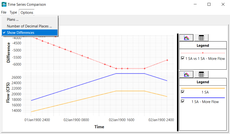 To see a plot of the difference between hydrographs, turn on the Options | Plot Differences menu item.