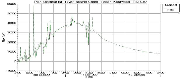 Cross Sections too Close. If the cross sections are too close together, then the derivatives with respect to distance may be overestimated (computed as steeper slopes than they should be), especially on the rising side of the flood wave. This can cause the leading edge of the flood wave to over steepen, to the point at which the model may become unstable. Figure 7-42 is an example where cross sections were placed very close together, and a very dynamic hydrograph was run through the river reach. The leading edge of the flood wave over steepened, and caused the model to produce an unstable result, which appears as a wall of water building just upstream of the flow going through critical depth. The solution to this problem is to remove some cross sections, which will allow the model to do a better job at computing the special derivatives.