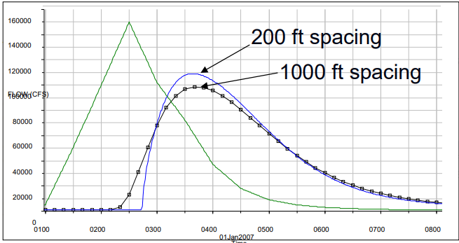 Figure 7 -41. The affects of cross section spacing on the hydrograph.