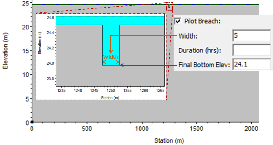 The Pilot Breach option requires a Width and Bottom Elevation.