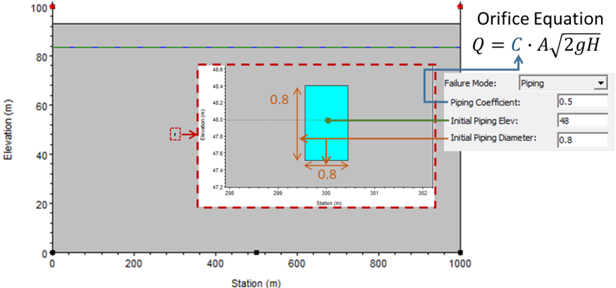Define the initial "diameter" for the piping conduit. Piping conduits in HEC-RAS are square. Therefore, the "diameter" is actually the width and the height of the piping conduit. Piping failures progress slowly at small diameters (with smaller flows and lower erosion rates), making the breach time sensitive to this parameter.