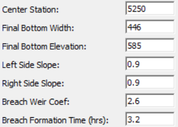 | WS Elev | HEC-RAS starts breaching when the the water surface elevation on one side of the structure reaches the specified value (Starting WS). |