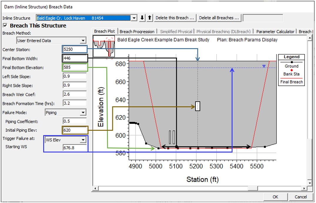 In addition to the User Entered Data in the left pane, the Breach editors have several tabs with additional features and data entry. The first tab (Breach Plot) displays the structure with the outline of the fully developed breach based on the User Entered Data. The second tab includes the Breach Progression data.