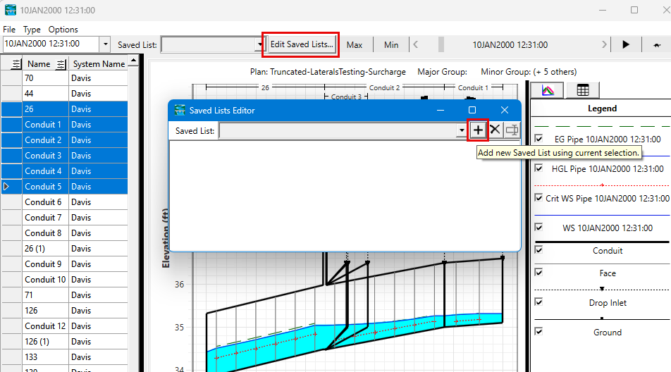 List of conduits can be saved such that the user can quickly see different groups of conduits from the profile plot using Saved Lists. To create a Saved List, select the desired conduits in the Profile plot, then select Edit Saved Lists... In the window that appears, hitting the + button will create a Saved List with the selected conduits and allow you to name it.