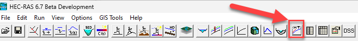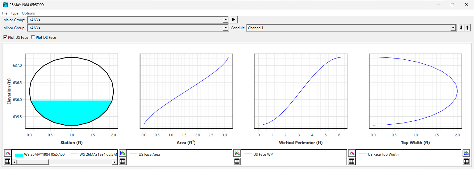 Once a simulation has been run, cross-section views of conduits along the the computed property tables can be accessed through the Hydraulic Property Tables button from the main RAS interface. The water surface and location in the corresponding property tables can be view for the US face of the conduit DS face of the conduit or both.