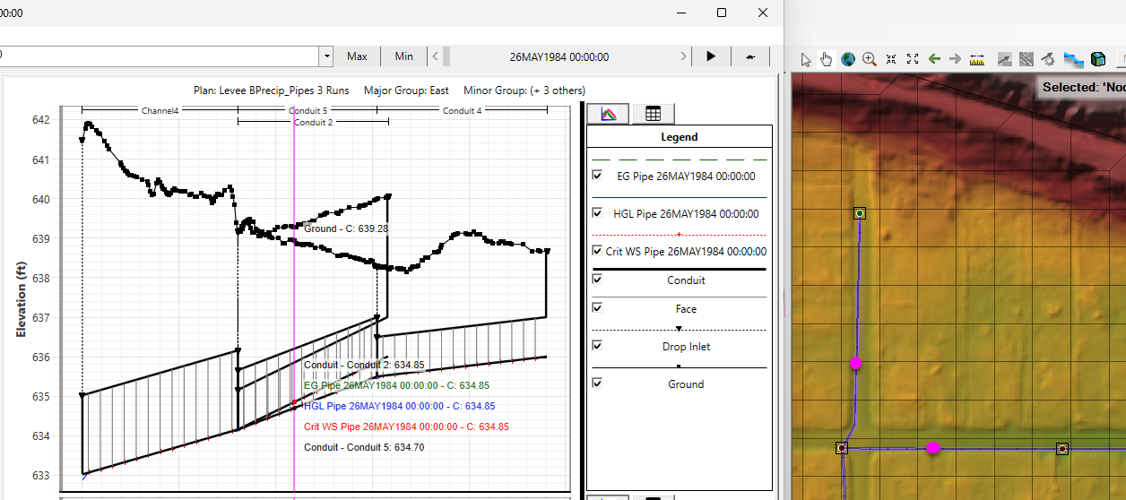 When hovering over the profile plot a bobber is shown at that location in RAS Mapper to indicate where the conduit is spatially in the model domain with magenta dots along the conduit.