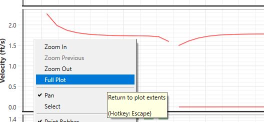 When viewing simulation results in the profile plot, and the velocity or flow profiles exceed the range of the axis, right click in the velocity or Flow plot and select Full Plot (Hotkey: Esc) to resize the y axis to fit the results.