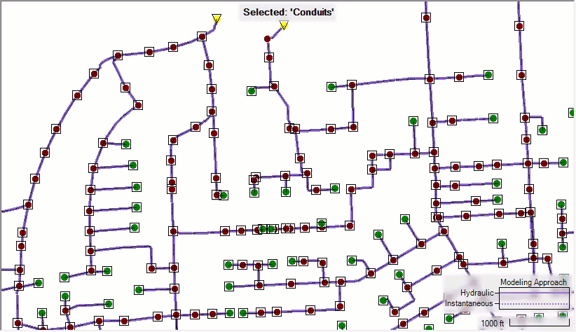 Similarly, the conduits along a path can be selected by first selecting two conduits, as shown below, then right-click > Show Conduits and selecting one of the two 'Path' options. Select Shortest Path will select the shortest path regardless of the conduit directions. Select Shortest Direct Path will select all the conduits in between following the drawn directions.