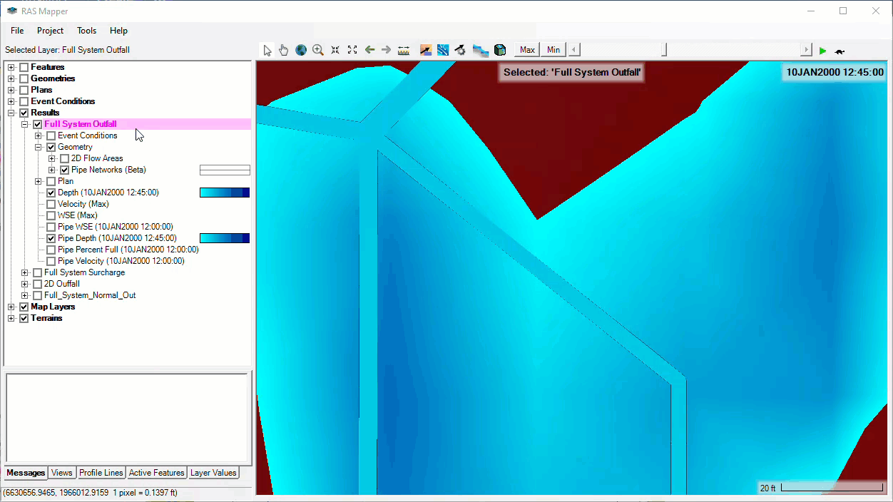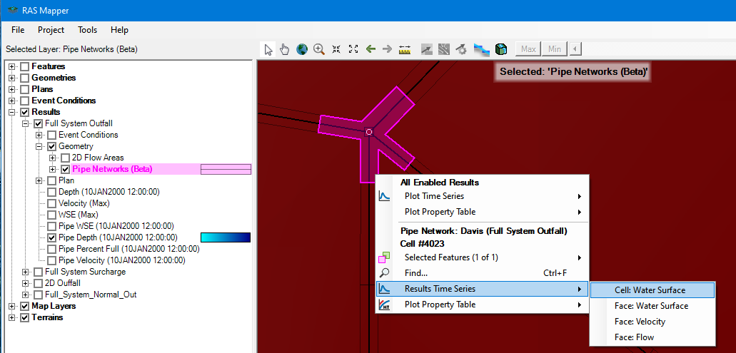 Similar to 1D and 2D model results, pipe network results are spatially plotted in the RAS Mapper. When a modeling simulation containing a pipe network completes, four new default map layers are added to the map window : Pipe HGL, Pipe Depth, Percent Full, Pipe Velocity.