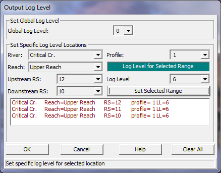 When the user selects Set Log File Output Level from the Options menu, a window will appear as shown in the figure below. The user can set a "Global Log Level," which will be used for all cross sections and every profile. The user can also set log levels at specific locations for specific profiles. In general, it is better to only set the log level at the locations where problems are occurring in the computations. To set the specific location log level, first select the desired reach and river station. Next select the log level and the profile number (the log level can be turned on for all profiles). Once you have everything set, press the Set button and the log level will show up in the window below. Log levels can be set at several locations individually. Once all of the Log Levels are set, press the OK button to close the window.