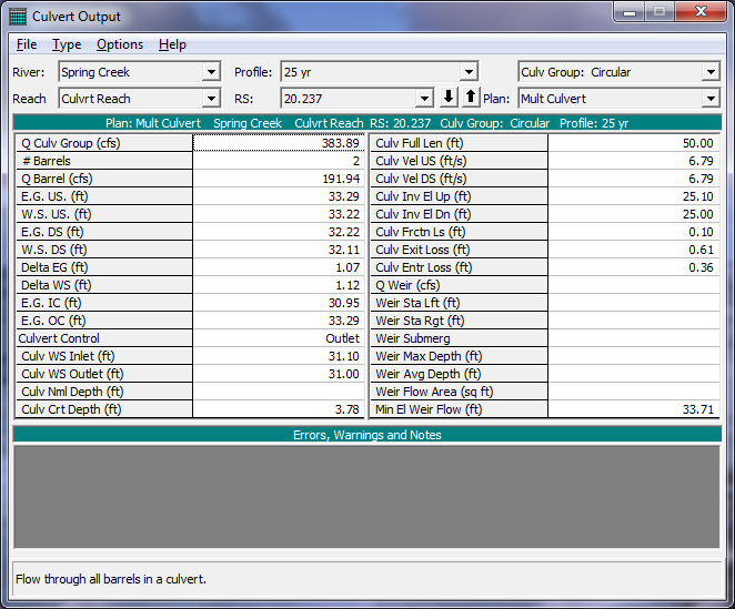 Culvert. The culvert table type brings up detailed culvert information. This table can be selected for normal culverts, or for culverts that are part of a multiple opening river crossing. An example culvert specific table is shown in in the figure below.