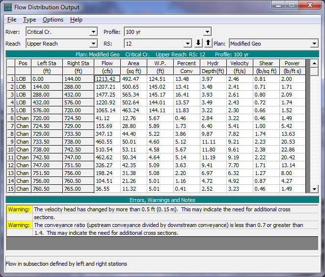 Flow Distribution In Cross Sections. The Flow Distribution table type can be used to view the computed flow distribution output at any cross section where this type of output was requested. An example of the flow distribution table output is shown in in the figure below.