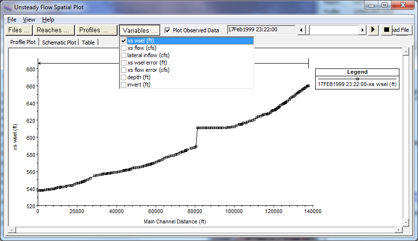As shown in Figure 8-28, the user can view either a profile plot, a spatial plot of the schematic, or tabular output. The user can select from a limited list of variables that are available at the computation level output. These are water surface elevation (XS WSEl); Flow (XS Flow); computed maximum error in the water surface elevation (XS WSEL ERROR); computed maximum error in the flow (XS FLOW ERROR); and maximum depth of water in the channel (DEPTH). Each of the plots can be animated in time by using the video player buttons at the top right of the window. This type of output can often be very useful in debugging problems within an unsteady flow run. Especially plotting the water surface error and animating it in time.