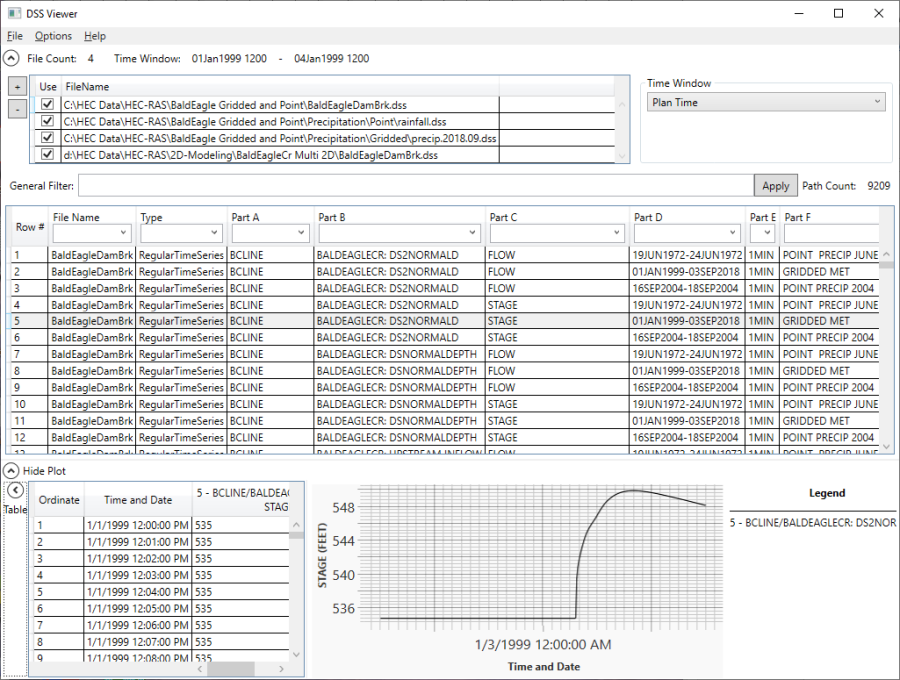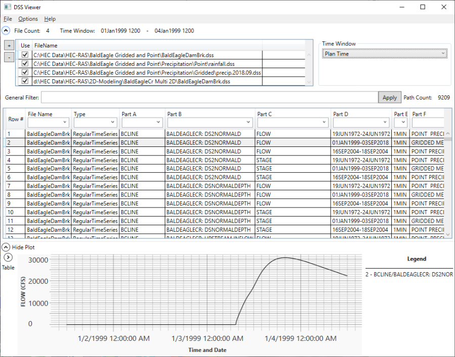 Data can be viewed from one or more DSS files simultaneously. The user simple selects the check box for the desired DSS files and picks the desired pathnames. The data will automatically be plotted and there is the option to tabulate the data.