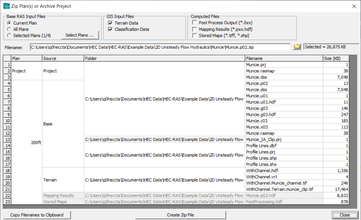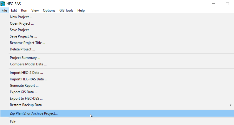 Archival of an HEC-RAS project is accomplished by creating a Zip file to store HEC-RAS files to a single file. This can be accomplished from the operating system, however, RAS will provide convenient file options. To save the current files to refer to at a later date or transmit to another user, select the File | Zip Plan(s) or Archive Project menu item on the main HEC-RAS Interface.