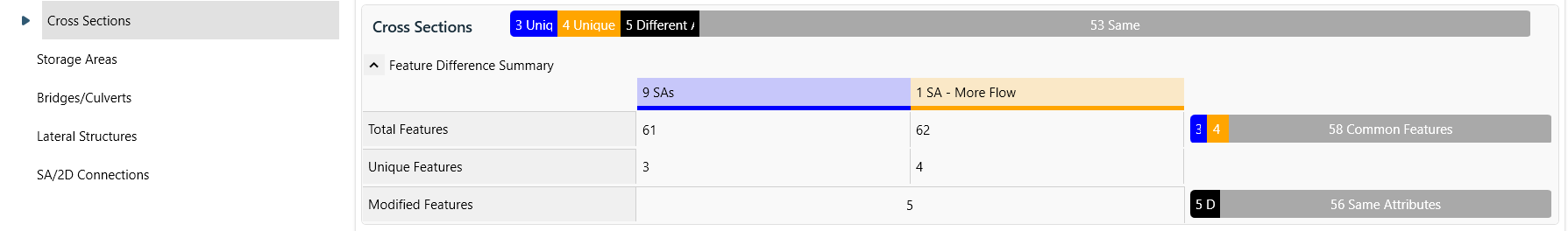 The upper portion of the window (shown below) provides a quick feature summary. For this example, one file has 3 Unique features, the other file has 4 Unique features, and the geometry shares 5 Features that have the same name but are different and 53 features that are identical. The color bar is able to provide a visual summary by color.