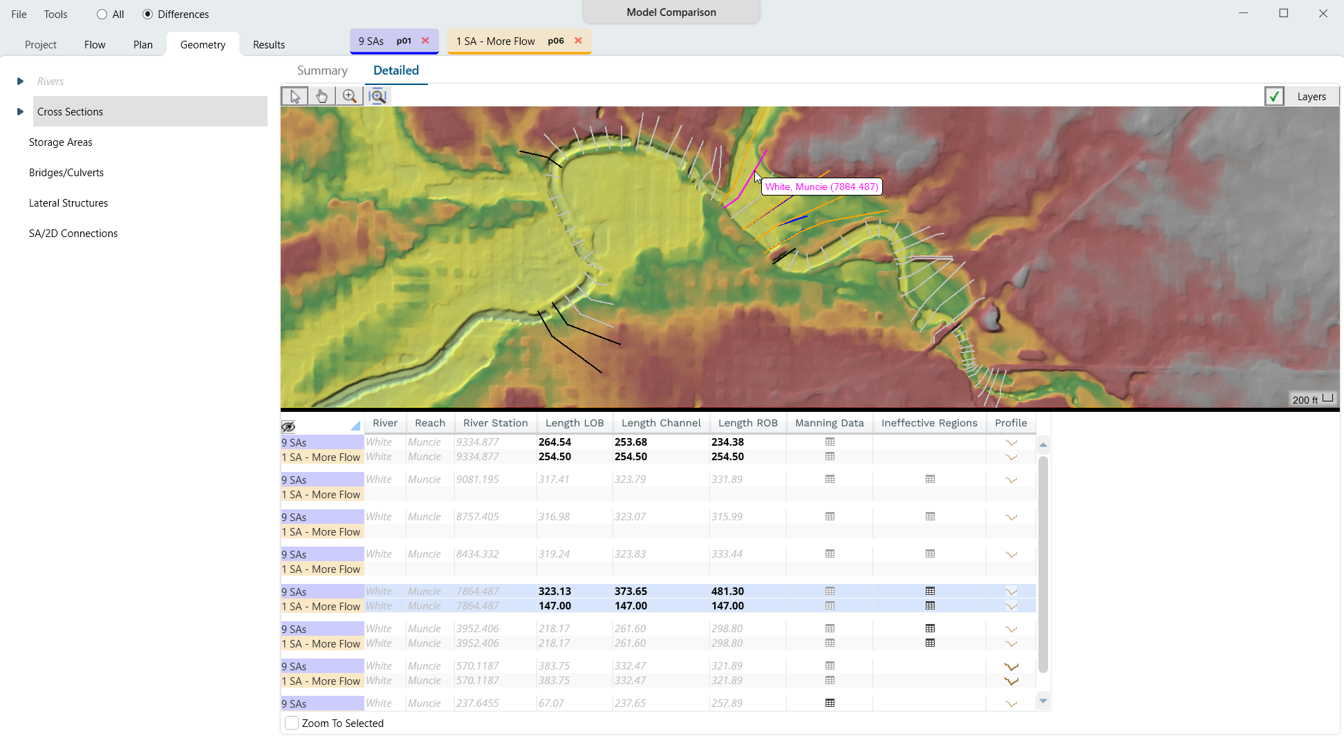 The Model Comparison Tool in HEC-RAS in intended to allow users to evaluate the components of an HEC-RAS project to identify differences in the primary modeling objects. The purpose of the comparison tools is to assist the user to identify subtle differences between HEC-RAS plans. If the model differences are significant and excessive Differences in the project files, geometry, flow, and results can be visualized through tables and spatial plots. The focus of the Model Comparison tools are for unsteady-flow models (comparison capabilities for steady-flow models is not as robust as for unsteady models).
