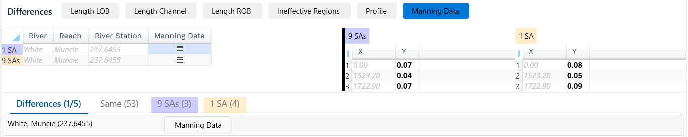 If you wish to sort the table by attribute difference, select the attribute element. For instance, you want to see which cross sections have difference n values, select the Manning Data attribute element. As shown below, the list of cross sections is filtered to just the cross section having different n values. The data can then be plotted either in a table or a plot, depending on the datatype. If the data are tabular data (such as Ineffective Flow Areas, Blocked Obstructions, Manning's n values) a table button will allow you to tabulate the data differences in a side pane.