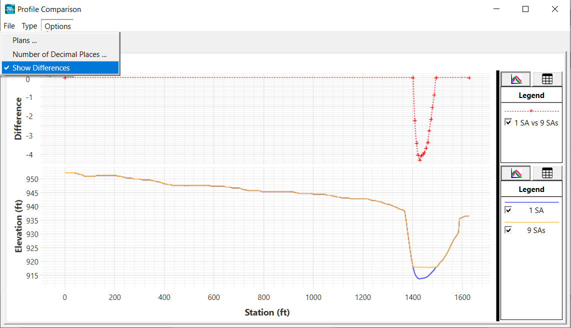 To see a plot of the difference between hydrographs, turn on the Options | Plot Differences menu item.
