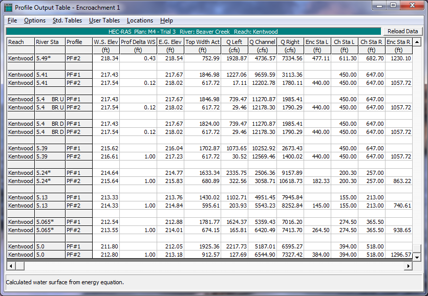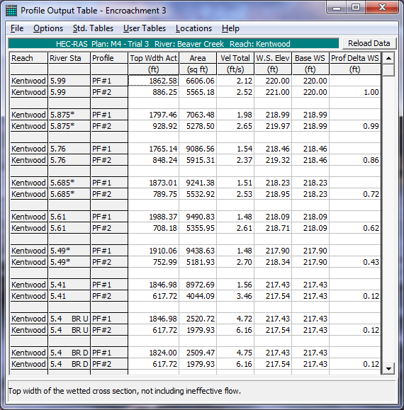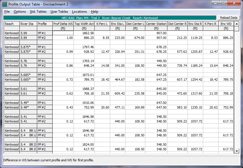 Encroachment results can also be viewed in a tabular mode from the Profile Output Tables. Select Profile Table from the View menu of the main HEC-RAS window. When the table comes up, the user can select from three different pre-defined encroachment tables. To bring up one of the encroachment tables, select Encroachment 1 from the Std. Tables menu on the Profile table window. An example of Encroachment 1 table is shown in the figure below. The table shows the basic encroachment results of: computed water surface elevation; change in water surface from the base profile; the computed energy; top width of the active flow area; the flow in the left overbank, main channel, and right overbank; the left encroachment station; the station of the left bank of the main channel; the station of the right bank of the main channel; and the right encroachment station.