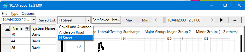 List of conduits can be saved such that the user can quickly see different groups of conduits from the profile plot using Saved Lists. To create a Saved List, select the desired conduits in the Profile plot, then select Edit Saved Lists... In the window that appears, hitting the + button will create a Saved List with the selected conduits and allow you to name it.