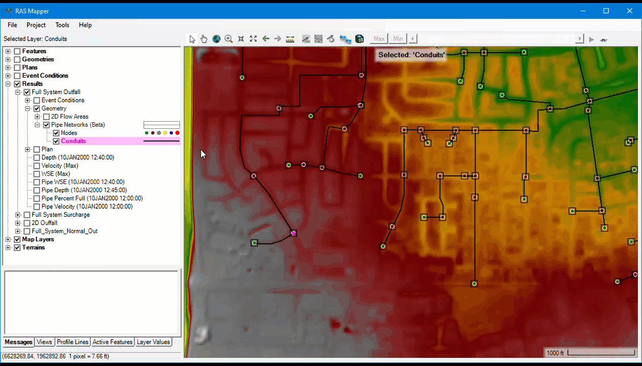 Similar to 1D and 2D model results, pipe network results are spatially plotted in the RAS Mapper. When a modeling simulation containing a pipe network completes, four new default map layers are added to the map window : Pipe HGL, Pipe Depth, Percent Full, Pipe Velocity.