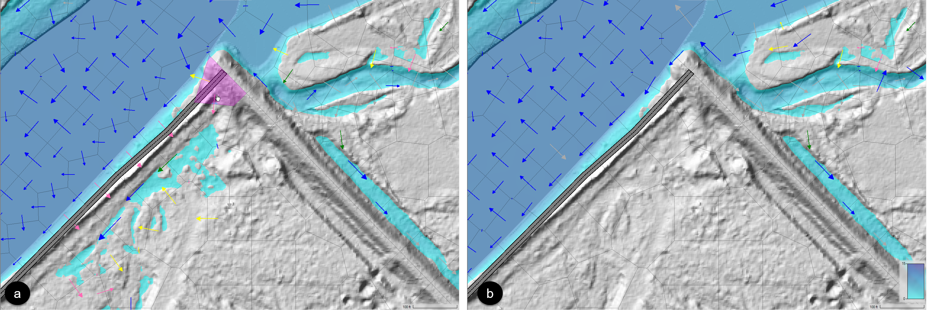 As shown in the figure below, (a) improper mesh development is allowing water to leak around high ground behind the levee (highlighted cell).  Water is not flowing over the levee as indicated by the velocity arrows.  However, with a properly enforced hydraulic structure shown in (b), flow is computed, as expected, and doesn't pass behind the levee.