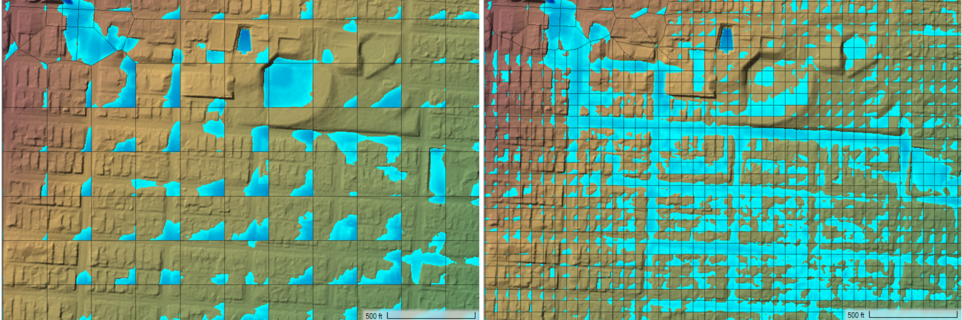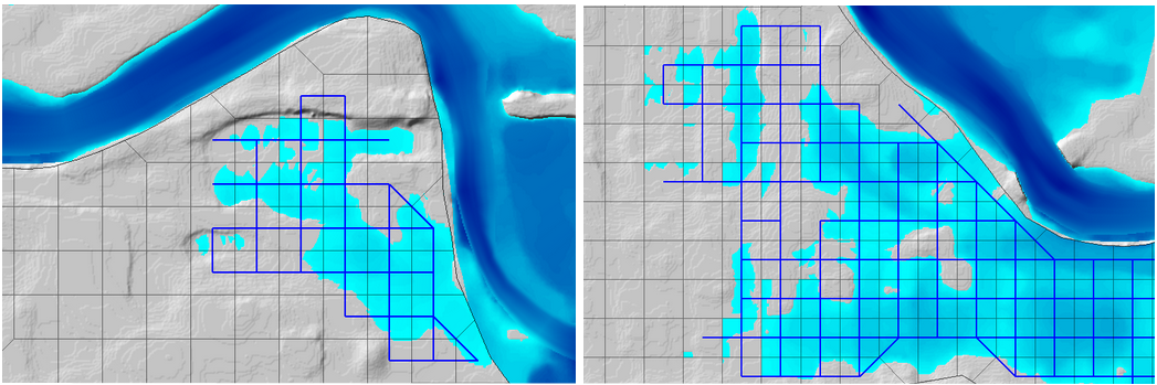 A comparison of inundation mapping results using the Sloping method (with depth-weighting and horizontal for shallow water options) for two different grid cell sizes is shown below.  HEC-RAS is able to properly route flow using the subgrid bathymetry, but RAS Mapper needs smaller cells to improve mapping.  With the larger grid cells, the interpolation surface does not know how to distribute flow with each cell.