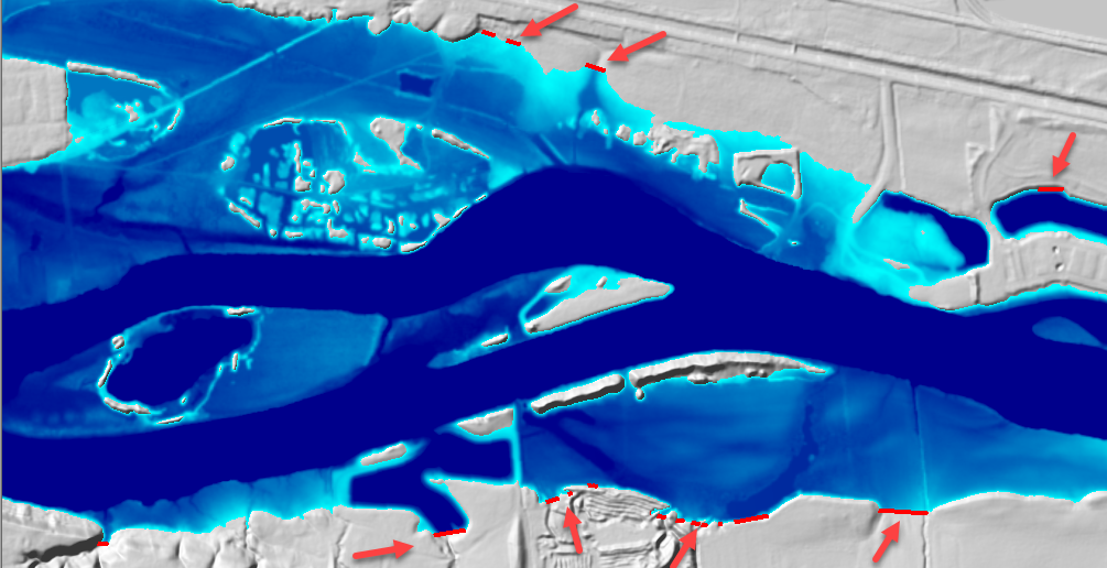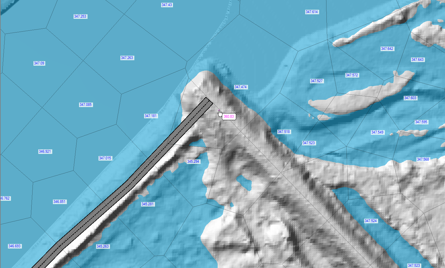 In the example below, the water surface elevations are plotted to quickly see that the water surface is lower that the high ground elevation for the surrounding levee.  This allows the modeler to more quickly identify a mesh (cell face) problems.