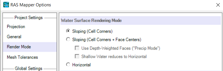 For 2D models, water surfaces within the cell are interpolated between computation points and face points.  How the interpolation is performed, however, is slightly different based on the Render Mode when evaluating the water surface. The Render Modes available within RAS Mapper are characterized as either Sloping or Horizontal.  These Render Modes are available from the Options | Render Mode menu item or by clicking the Render Mode button.  The mapping options are shown in the figure below.  The Sloping (Cell Corners) method is the default method.
