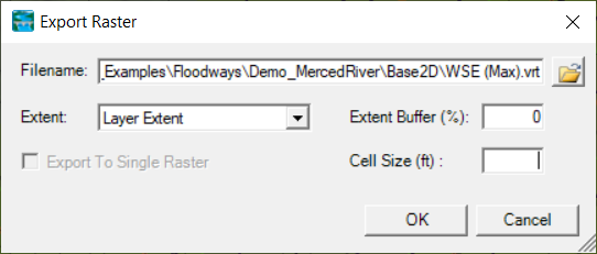 The Export Raster option allow to store map results to a raster dataset in the GeoTiff file format.  This output option allows you to specify the bounds of export by choosing the Extent and Extent Buffer (as a percentage).  You can further use this option to resample the raster data to the desired Cell Size (leaving this field blank will use the default cell size specified by the underlying RAS Terrain).  Lastly, if the RAS Terrain is comprised of multiple tiles, you can export the map to a single GeoTiff using the Export To Single Raster option.
