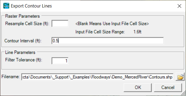 The As Contour Lines option allow to generate vector contours at a specified contour Contour Interval.  Using the base data may result in long processing times (without improving output), therefore, you may want to resample the base map prior to contouring the data.  Provide a value for the Resample Cell Size entry (if you leave it blank the export will use the base cell size from the RAS Terrain).  Providing a Filter Tolerance will remove redundant points.